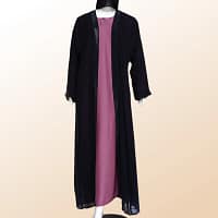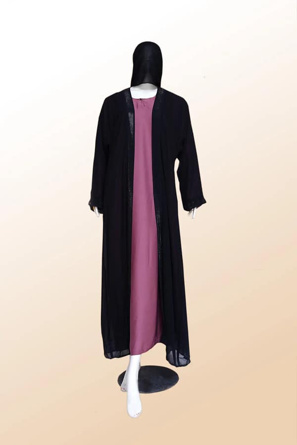 Step into elegance with the Huda pink Kimonos Abaya set crafted from chiffon Kimono featuring a paneled premium quality Nida fabric inner maxi perfect for the refined formal gathering.