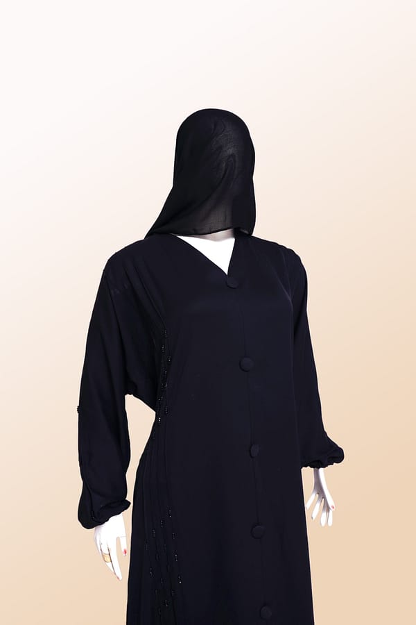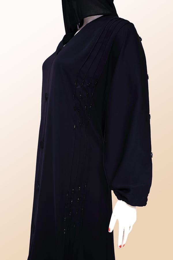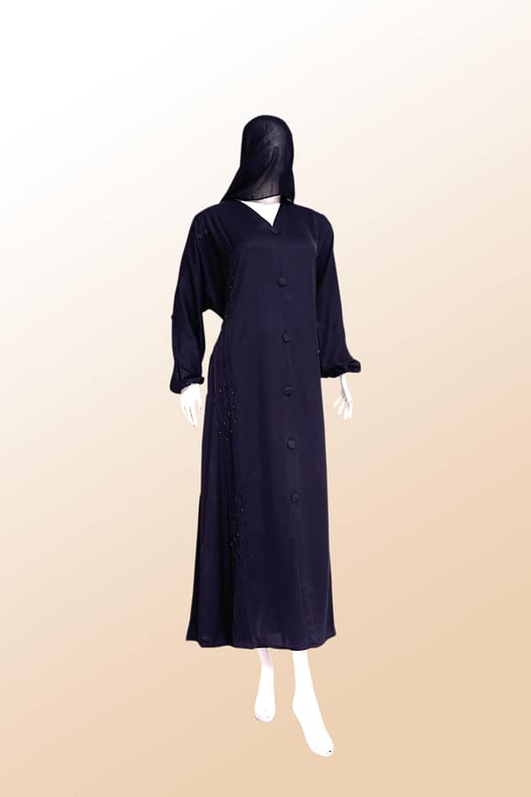 It is a premium quality Nida fabric Layla Abaya perfect for formal occasions. Beautiful crafted and comfortable fabric use high quality matching buttons on front of Layla Abaya. Layla Abaya crafted pintex on front and also use handwork on front and sleeves for refined touch.